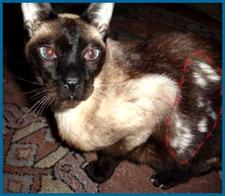 One early spring when Astro was not quite six years old, I noticed some white spots on the fur on his flanks. Around the same time, he had also begun losing weight and throwing up whiteish foam once or twice a day. He had become lethargic, had lost his appetite and had started acting strangely, plucking chunks of fur from his coat.